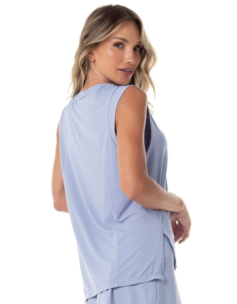 A Blusa Manga Curta Dry Fit Lorena possui modelagem alongada e comprimento assimétrico.