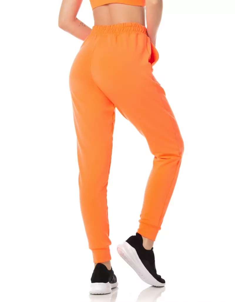 Calça com bolsos laterais, com modelagem mais próxima ao corpo.