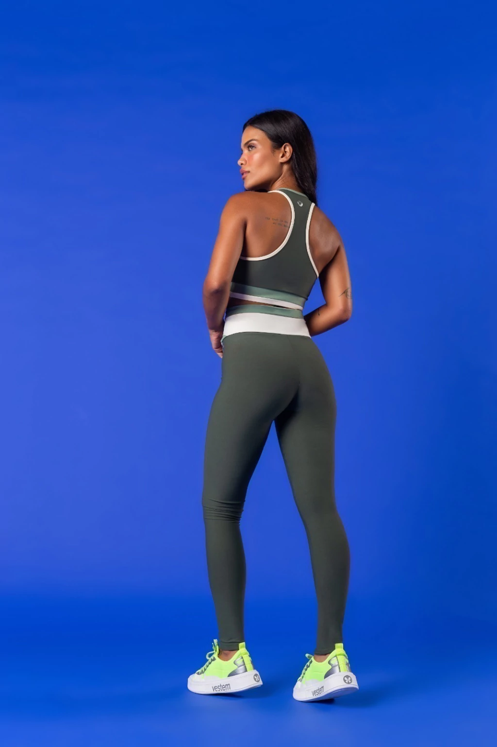Legging Fusô Berlim, feita com modelagem mais ajustada, possui detalhes em cores contrastante no cós.