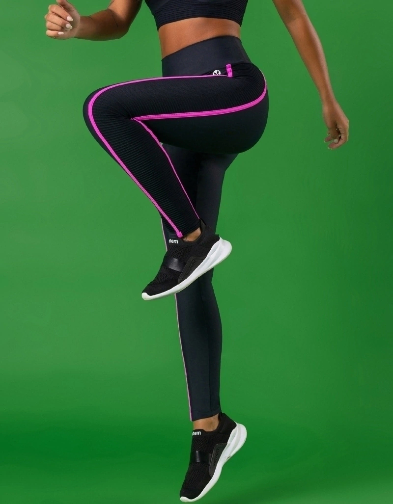 A Legging Fusô Split, com cós anatômico e recortes texturizados nas laterais dão à peça um ar de modernidade e versatilidade.