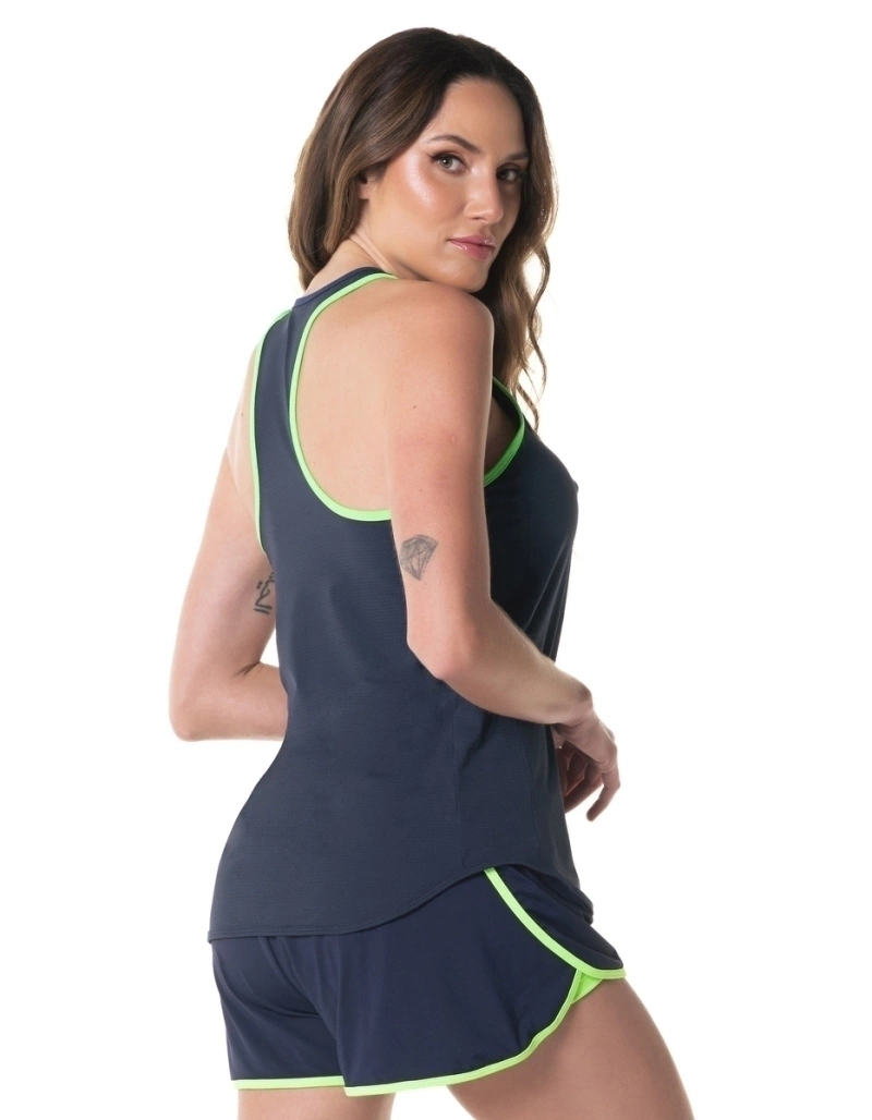 A Regata Dry Fit Roller possui modelagem alongada com recortes laterais, decote e cavas contrastantes e barras arredondadas.