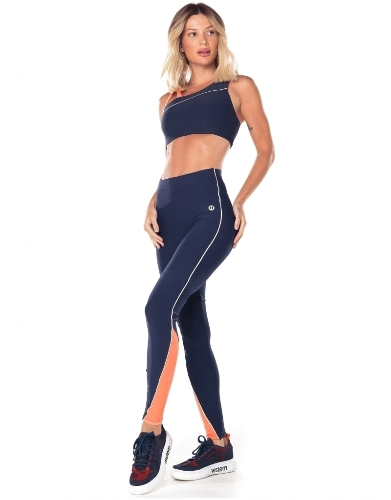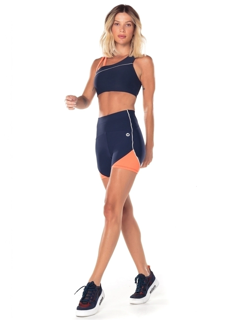 O Top Assimétrico Média Sustentação Astra possui decote e alças assimétricas e em cor contraste, com corpo em recortes e detalhe em friso tricolor que modela a silhueta e trazem detalhes em cor; características que dão à peça um visual moderno e feminino.